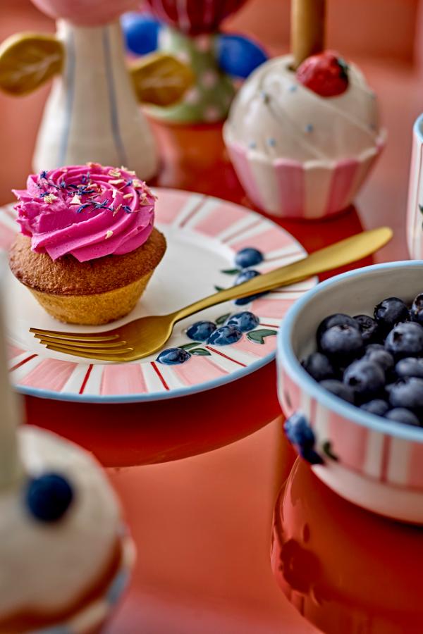 Der Carry Teller von Bloomingville ist ein Steingutteller mit cremefarbener Basis, roséfarbenen Streifen, tiefblauen Beeren und grünen Blättern sowie einem hellblauen Rand. Da sie geprägt und von Hand bemalt sind, können kleine Abweichungen im Muster und in der Farbintensität vorkommen – jedes Stück ist ein Unikat.