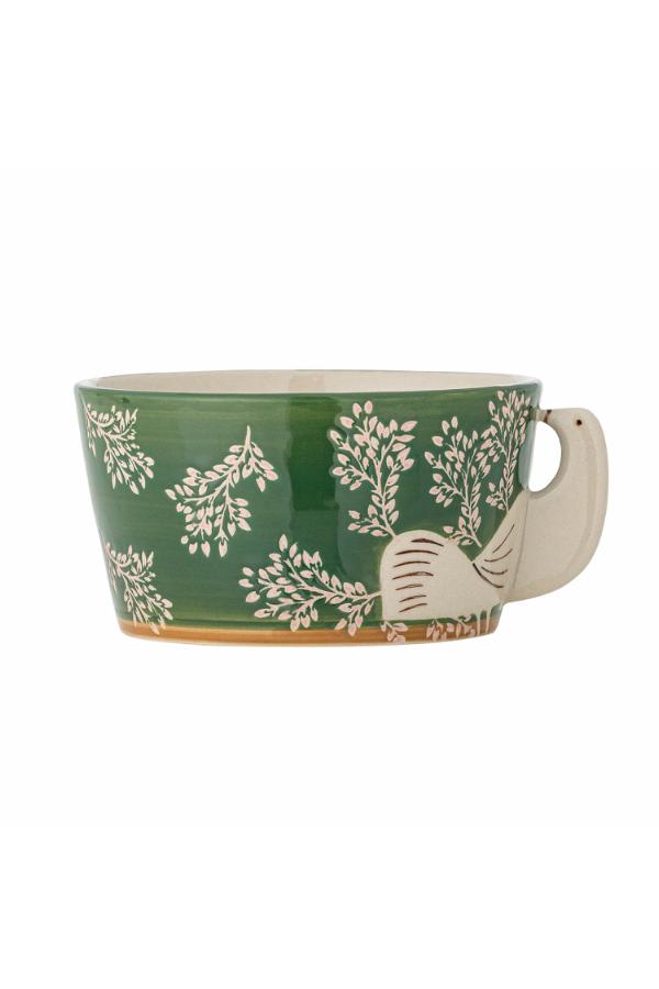 Die Hezha Schale von Bloomingville ist aus Steingut gefertigt und mit einer warmen Glasur versehen. Zart rosafarbene, handgemalte Blattzweige schmücken die grüne Oberfläche, ein cremefarbener Vogel bildet den Griff. Der sanft braune Boden verleiht eine rustikale Note.