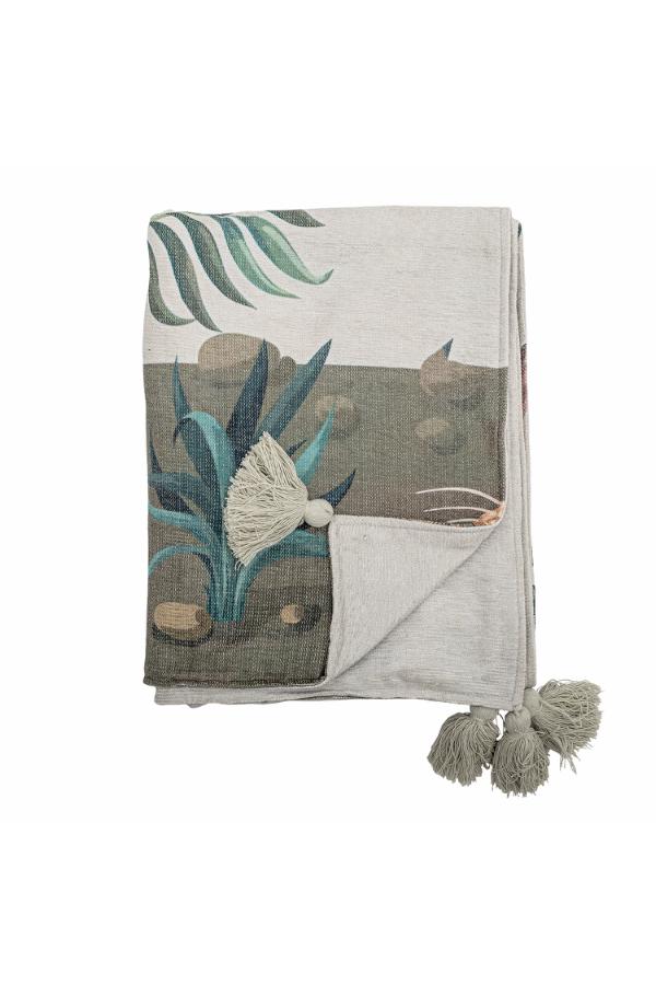Die Pfauendecke von Creative Collection ist aus gewebtem Polyester gefertigt und zeigt ein bedrucktes Blattmuster in warmen Tönen neben der großen Darstellung eines Pfauen. Die Rückseite ist schlicht, und jede Ecke ist mit hellgrünen Quasten verziert.