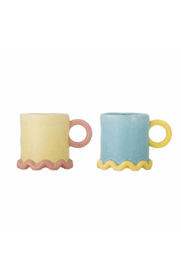 Der Polly Becher von Bloomingville ist ein süßer Becher aus Steingut mit glänzender Glasur und gewelltem Fuß. Er ist in zwei Varianten erhältlich: warmes Gelb mit rosafarbenen Details und zartes Blau mit gelben Akzenten. Beide Varianten sind handbemalt. Kleine Abweichungen im Muster und in der Farbintensität sind daher möglich und machen jedes Stück zum Unikat.