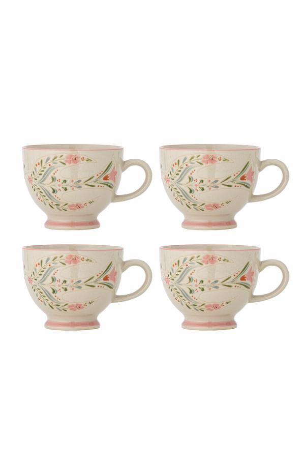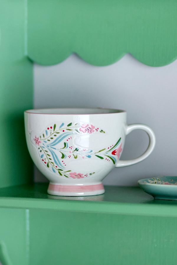 Der zarte Rosalynde Becher von Creative Collection zeigt ein handgemaltes Blumenmotiv mit roséfarbenem Rand und Fuß. Kleine Abweichungen im Muster und in der Farbintensität sind möglich und machen jedes Stück zum Unikat.