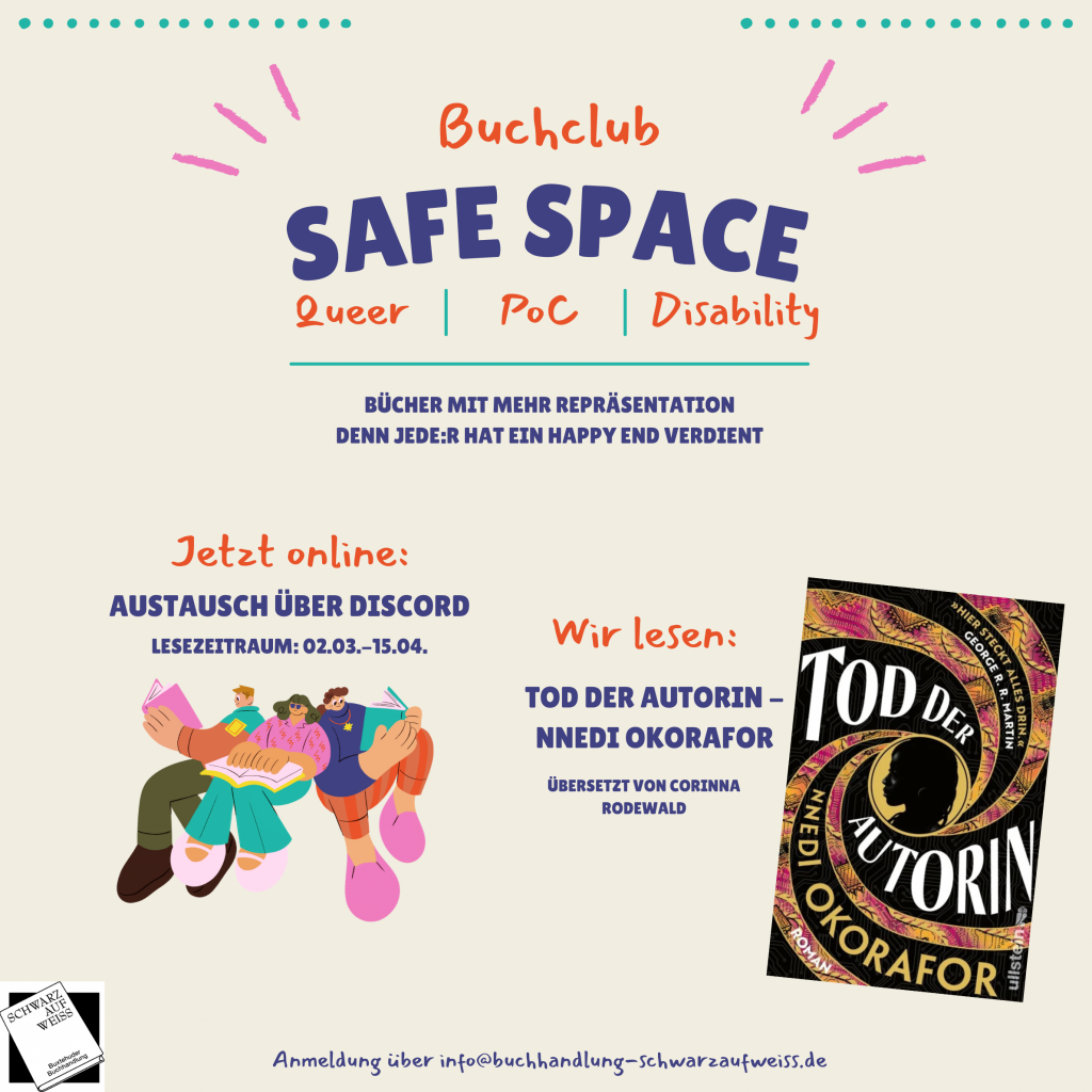 im Rahmen der Internationalen Wochen gegen Rassismus lesen wir „Tod der Autorin“ von Nnedi Okorafor. Am 15. April findet dann ein gemeinsames Treffen mit dem BookTALK Buchclub im Buchladen statt, bei dem wir uns über das Buch austauschen können. Bis dahin könnt ihr euch wie immer auch über den Discordserver austauschen.