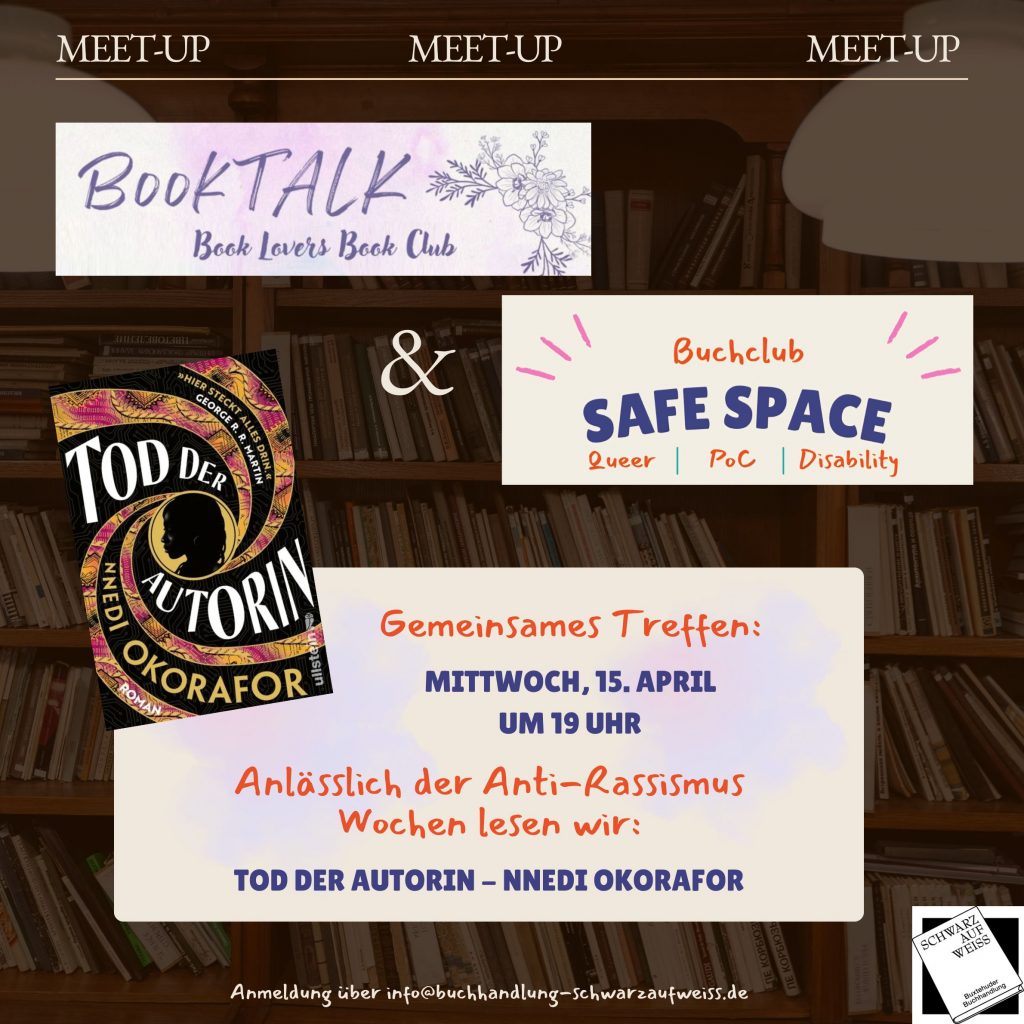 anlässlich der Anti-Rassismus Wochen im März lesen wir Buchclub übergreifend das Buch „Tod der Autorin“ von Nnedi Okorafor. Am 15. April treffen wir uns dann gemeinsam, der Safe Space Buchclub und der BookTALK Buchclub, bei uns im Buchladen, um uns über das Buch auszutauschen.