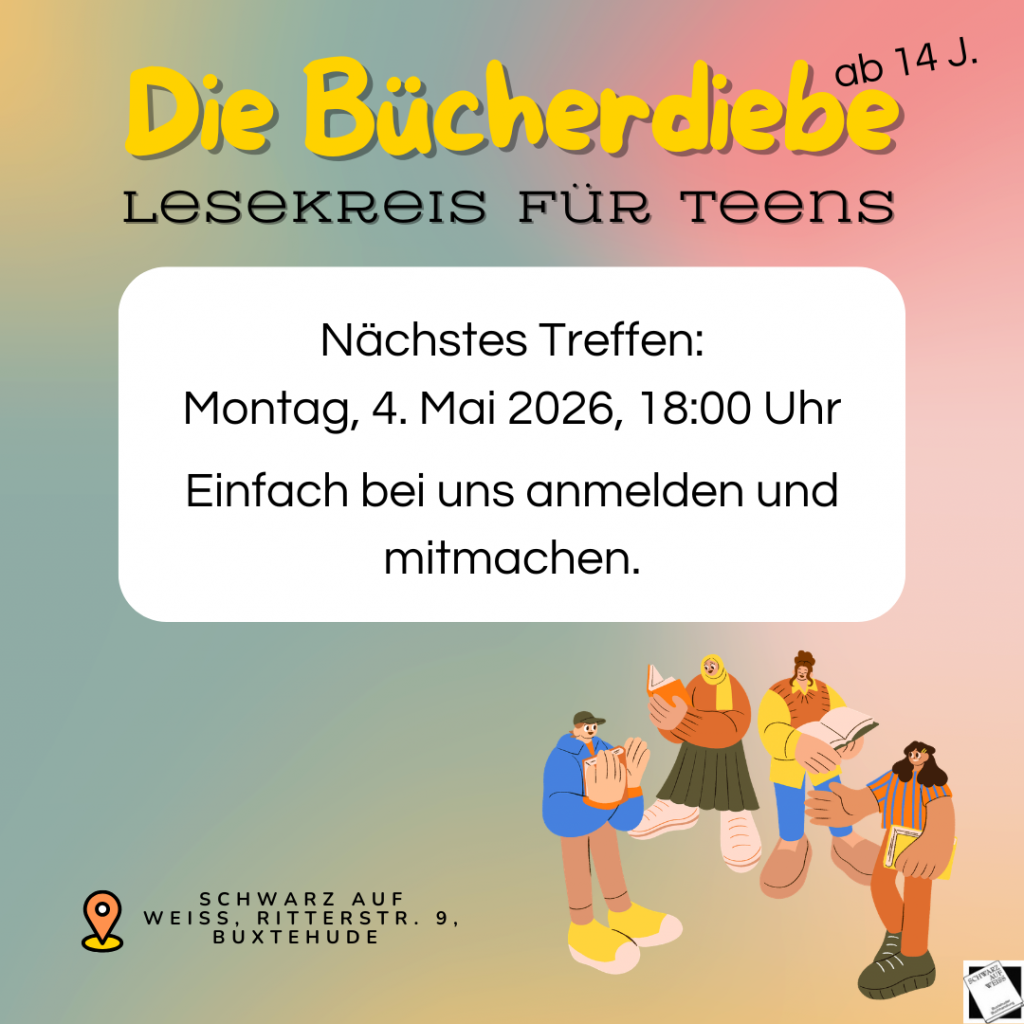 Einmal im Monat treffen sich „Die Bücherdiebe“ bei uns im Buchladen. Alle Teens, die gerne lesen sind bei uns willkommen. Wir reden über Bücher, egal welches Genre und tauschen uns darüber aus: Was ist wirklich gut oder auch total doof an diesem oder jenem Buch? Kann man es anderen weiter empfehlen? Wenn ja, warum?